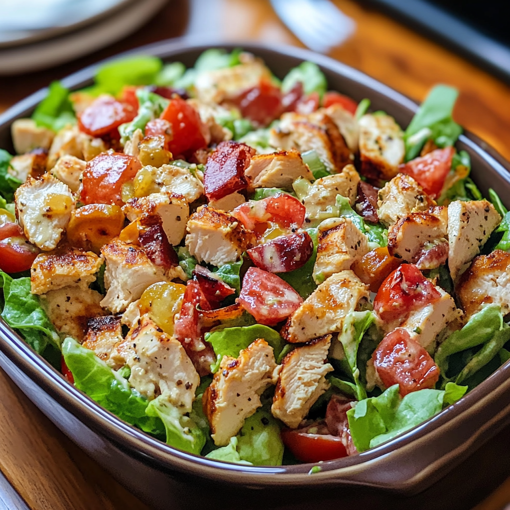 If you’re looking for a salad that doesn’t feel like diet food, this is it. It’s packed with protein from the grilled or shredded chicken, satisfying crunch from the lettuce and crispy turkey bacon, and just the right amount of creaminess from the dressing. The contrast of flavors makes it a dish you’ll crave again and again.