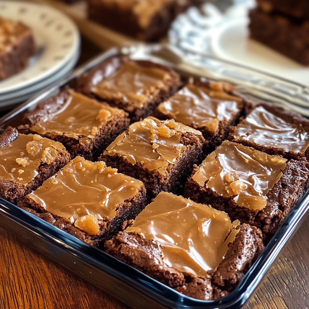 - Drizzle the butterscotch sauce over the brownie layer, reserving about 2 tablespoons for topping. Use a toothpick or knife to gently swirl the sauce into the batter.