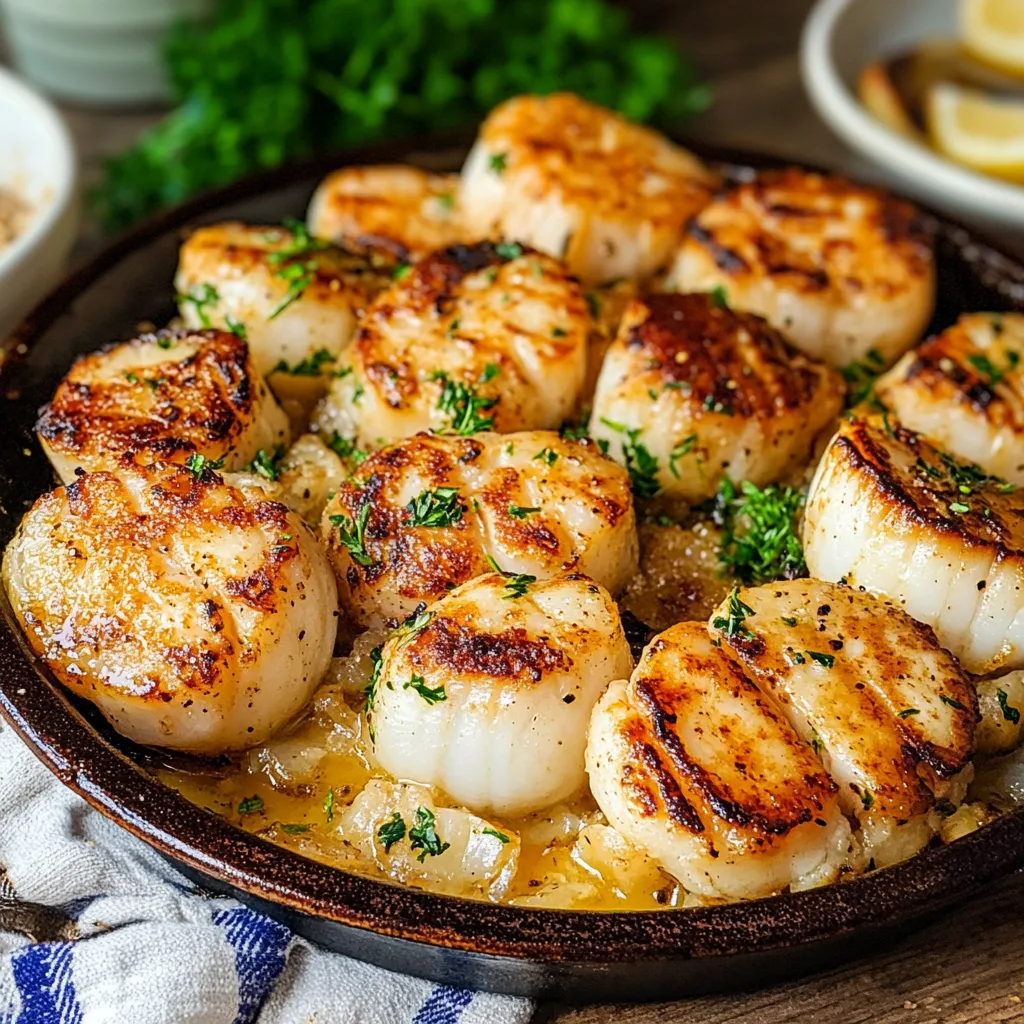1. Plating: Arrange the scallops on a large plate or platter, adding a sprinkle of parsley for a pop of color.