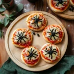 6. Create Spiders: For each mini pizza, place pieces of pepperoni cut into small circles for the spider body. Use olive slices to make the legs. Arrange four pieces on each side of the pepperoni body.